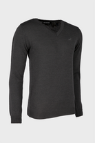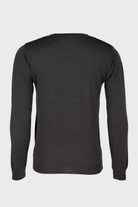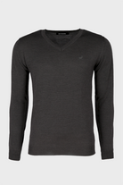 Super blød trøje af 50% ekstra fin italiensk merino uld og 50% akryl, hvilket gør den virkelig behagelig at bære. Den har lange ærmer og v-hals.